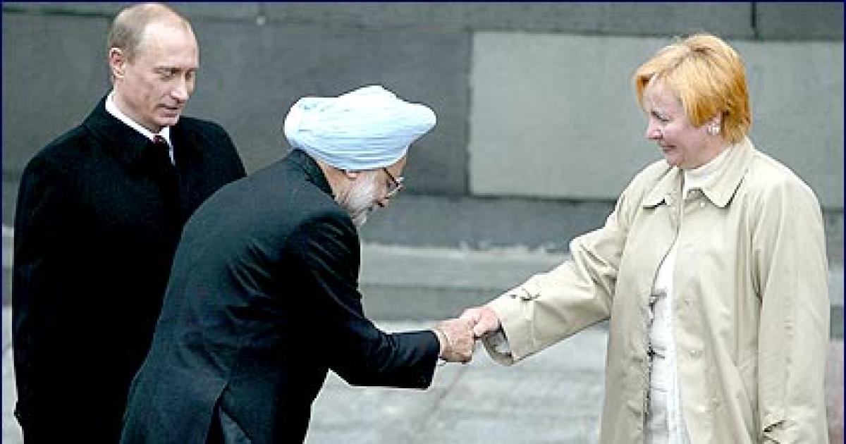 Russian President Vladimir Putin and his wife Ludmila greet Prime Minister Manmohan Singh before the grand military parade at the Red Square in Moscow on Monday.
