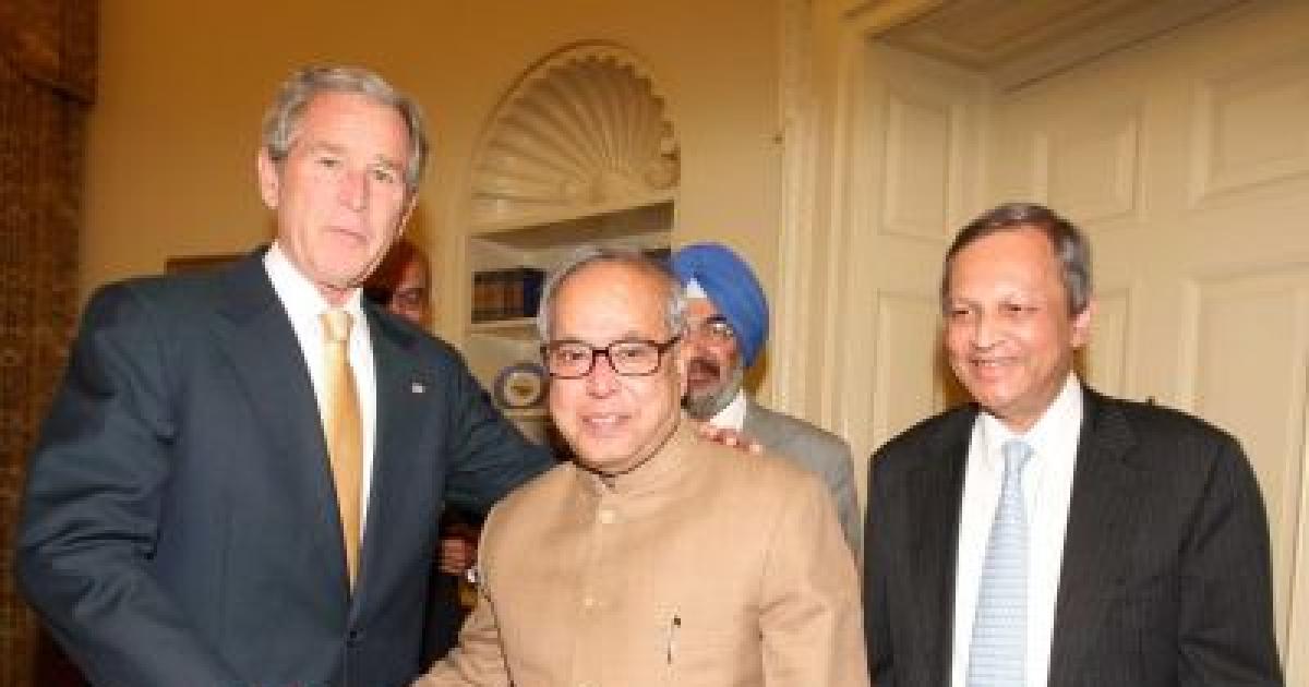 Image: US President George W Bush with External Affairs Minister Pranab Mukherjee and Indian Ambassador Ronen Sen.