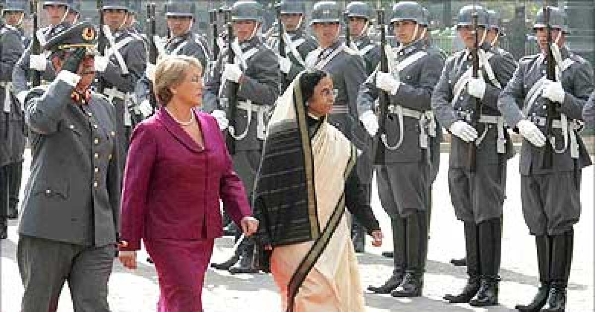 Image: President Pratibha Patil and President of Chile Michelle Bachelet at a Guard of Honour at the Constitution Square during the ceremonial reception at Santiago in Chile on Monday.