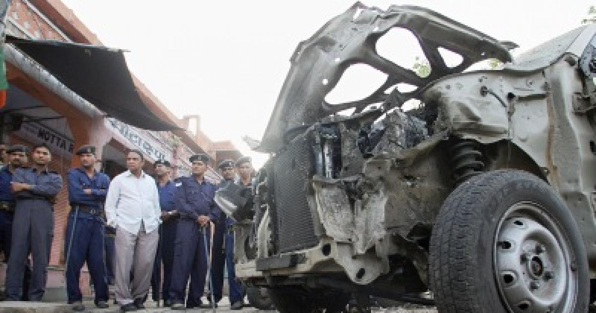 Image: Security personnel stand near the wreckage of a car at one of the blast sites in Jaipur.