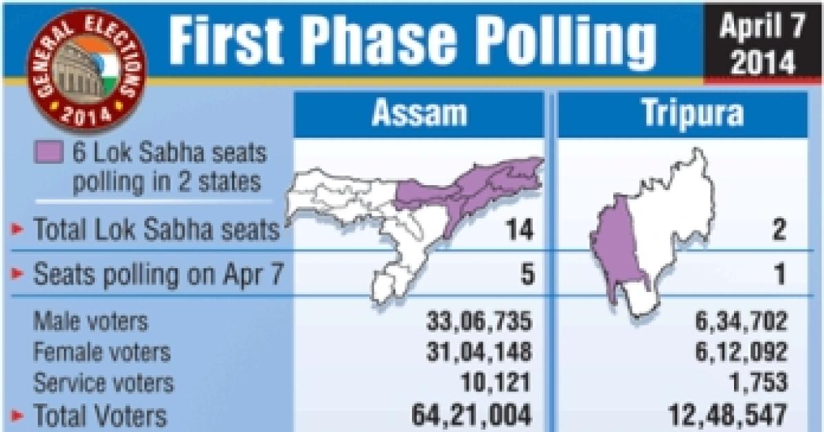of polling to be held in five parliamentary constituencies Assam namely, Tezpur, Kaliabor, Jorhat, Dibrugarh and Lakhimpur on April 7. The electorate comprise of 33, 21,567 male voters and 31, 20,067 female voters. Campaigning for the first phase has come to an end in the state on Saturday afternoon.