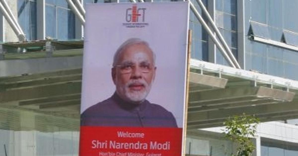 Image: Workers carry a hoarding of Gujarat Chief Minister Narendra Modi in Ahmedabad