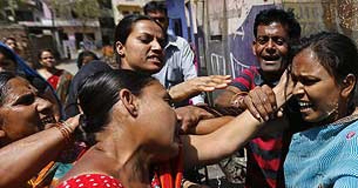 Image: Local residents fight to collect free drinking water from a municipal corporation water tanker in Ahmedabad