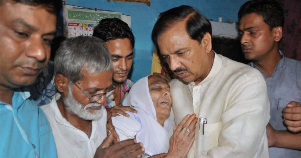 Image: BJP's Mahesh Sharma consoles the bereaved members of Mohammed Iqlakh, the man who was lynched over beef rumours. Photograph: PTI