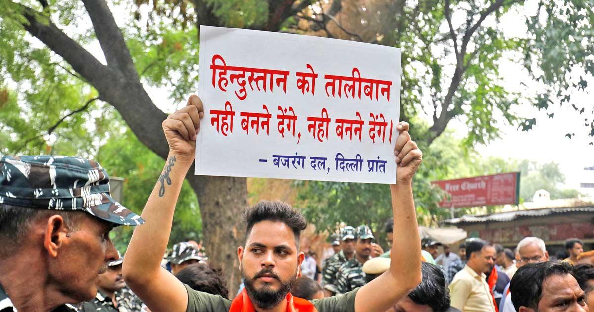 IMAGE: A Bajrang Dal activist displays a placard during a protest against Kanhaiya Lal's killing in Udaipur. The placard reads: 'We won't let Hindustan become Taliban'. Photograph: Amit Dave/Reuters