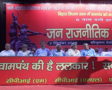 Addressing the meeting, senior CPI leader A B Bardhan said “We are starting an agitation for the state and the country. We will awaken the people of Bihar to defeat the feudal, communal, corporate forces led by BJP and the opportunistic alliance of Prasad, Kumar and Congress.”