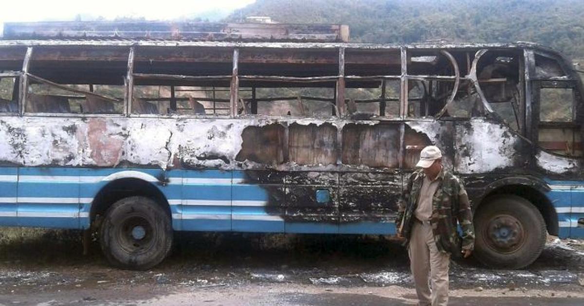 IMAGE: A charred bus burnt down by United Naga Council supporters at Senapati, Manipur. Photograph: PTI Photo