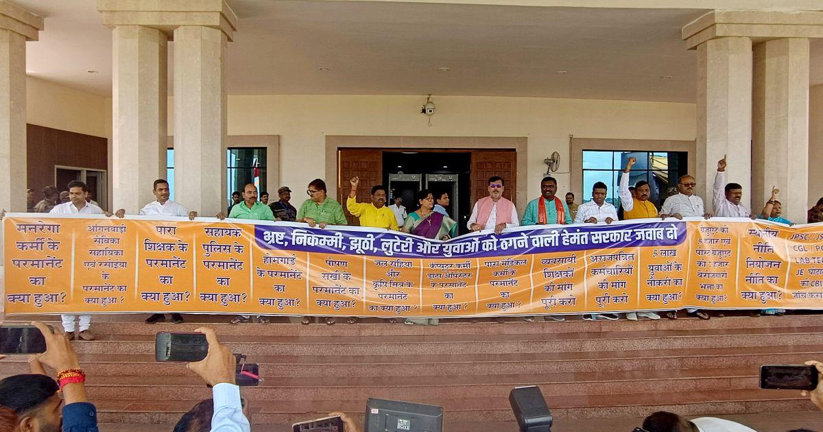 Several BJP MLAs of Jharkhand spent Wednesday night in the assembly lobby after marshals evicted them from the well of the House where they were protesting against Soren's alleged refusal to reply to their questions on key issues including employment.
