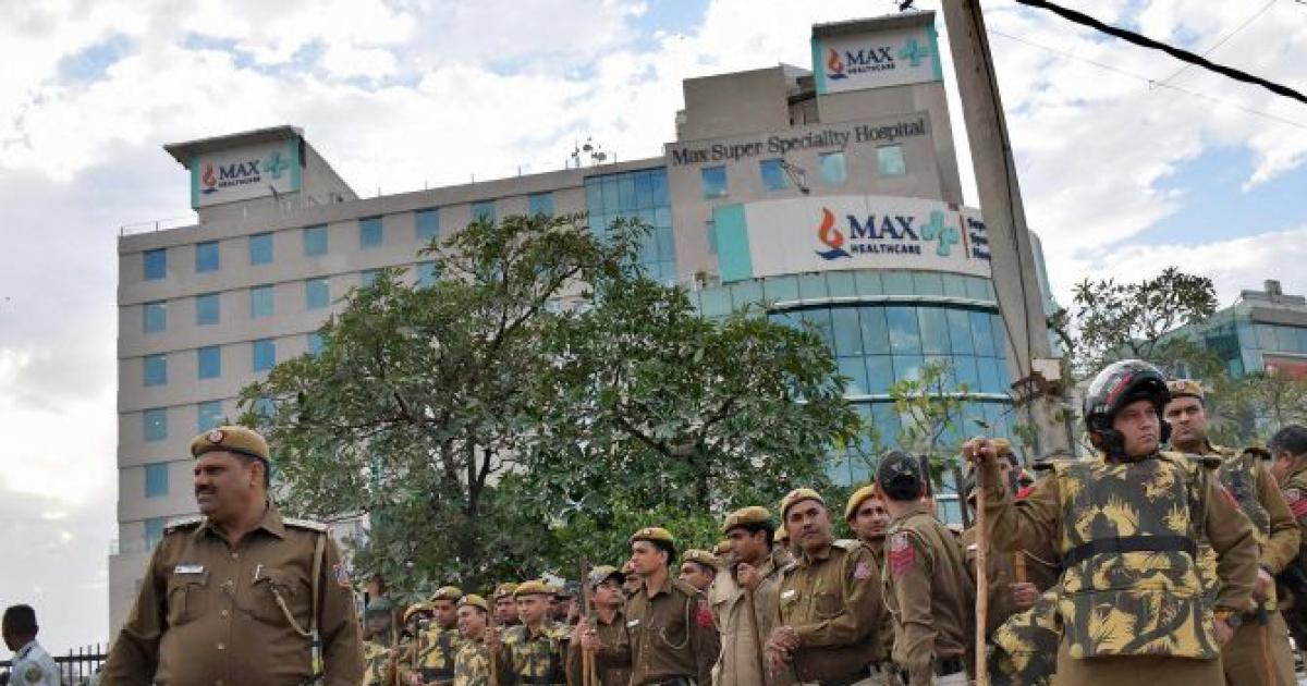 Image: Police force deployed outside Max hospital, Shalimar Bagh where a newborn baby was declared dead, in New Delhi. Photograph: PTI Photo