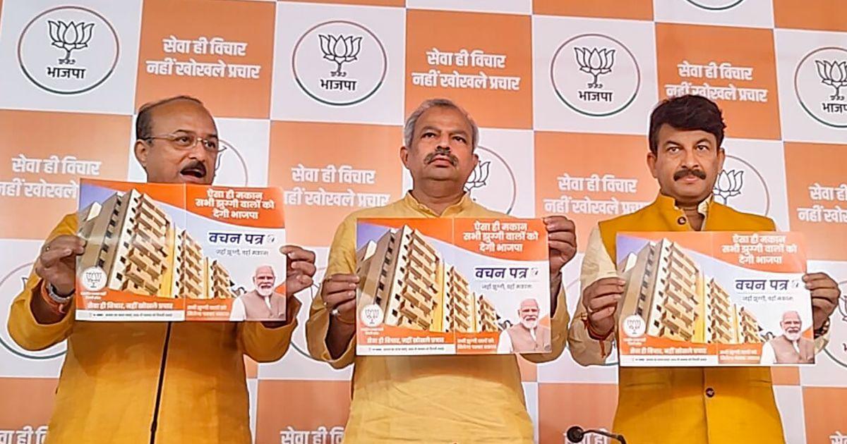 The 'Wachan Patra' (pledge letter) released by Delhi BJP president Adesh Gupta, MP Manoj Tiwari and MCD poll management committee head Ashish Sood carried the pictures of flats allotted to slum dwellers recently in Kalkaji.