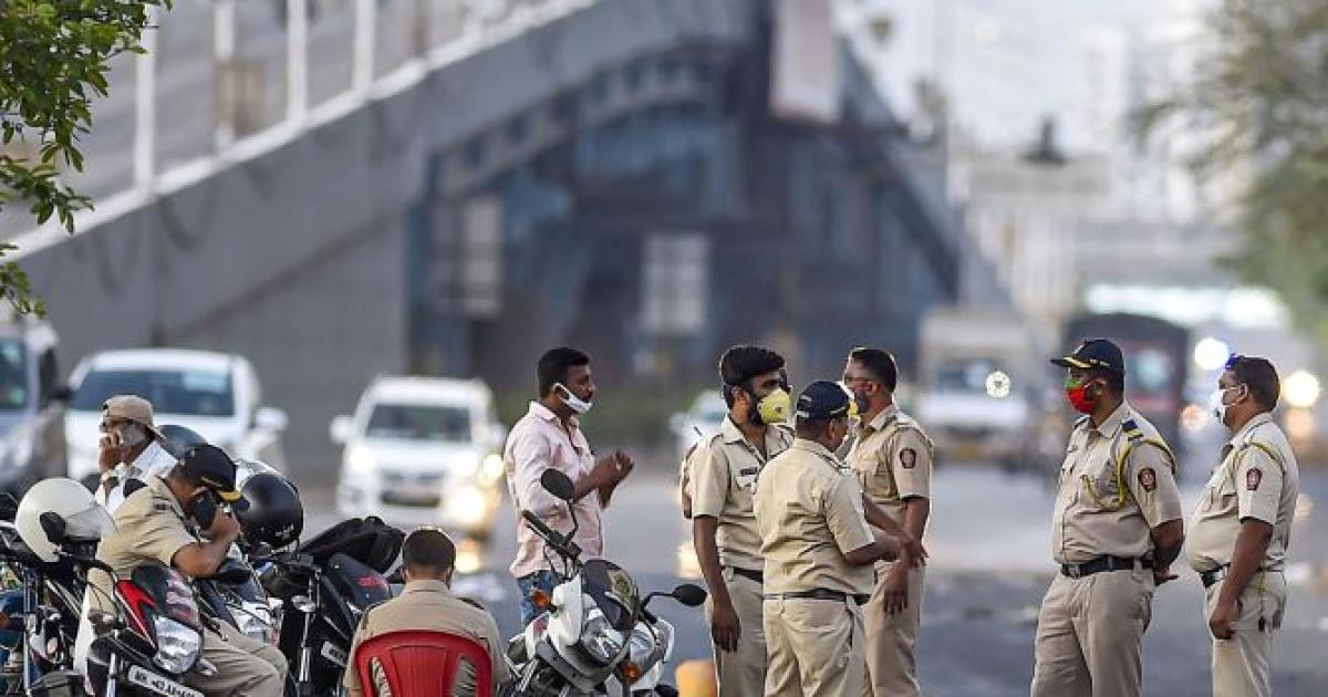 IMAGE: Police personnel stop migrants on their way back to reach native places on Eastern Express Highway, during a nationwide lockdown as a preventive measure against the coronavirus pandemic, at Mulund in Mumbai, on Sunday. Photograph: Kunal Patil/PTI Photo