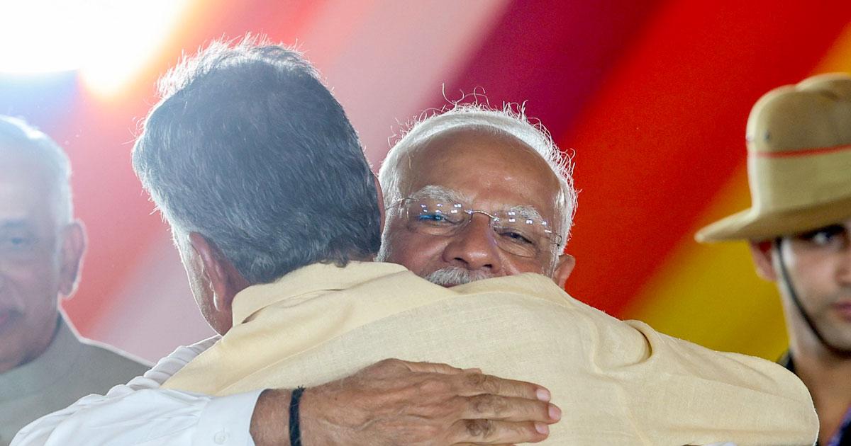 IMAGE: Modi, famous for hugging foreign leaders, gives an Indian leader a taste of the famous Modi hug, here and below. All Photographs: ANI Photo