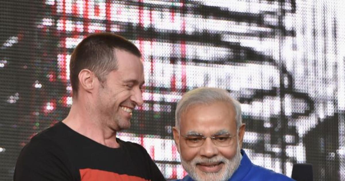 Indian PM Narendra Modi hugs Hugh Jackman after delivering a rousing speech at the festival. Photograph: Getty Images