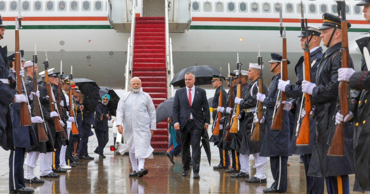 Modi arrived at the Joint Base Andrews in Washington, DC where he was given a guard of honour amid incessant rains. The Prime Minister, who was wearing a raincoat, stood for the national anthem of the two countries.