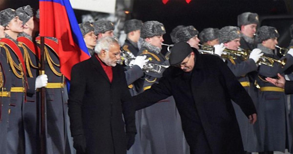 Modi started walking following a gesture by a Russian official when the military band was playing India's national anthem at the Vnukova II airport.