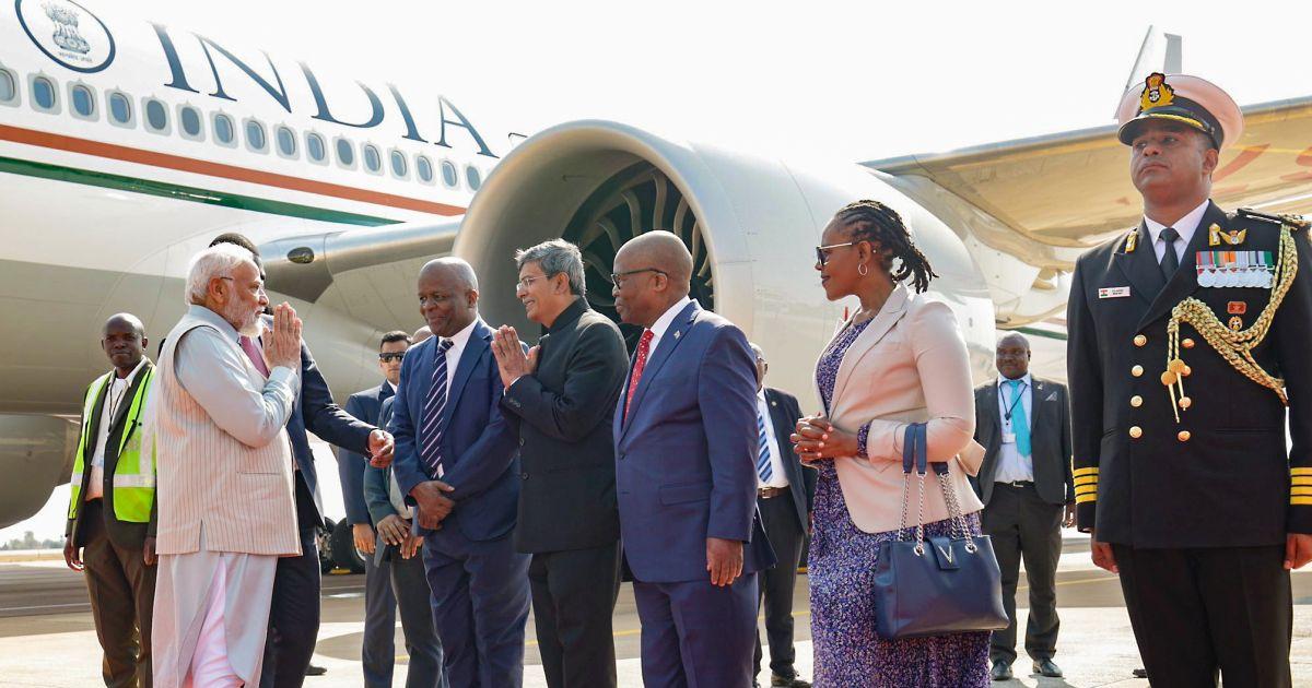 'PM @narendramodi touches down at the Waterkloof Air Force Base, South Africa. Warmly received by Deputy President @PMashatile of South Africa. Accorded a ceremonial welcome upon arrival,' Ministry of External Affairs spokesman Arindam Bagchi said in a post on X.