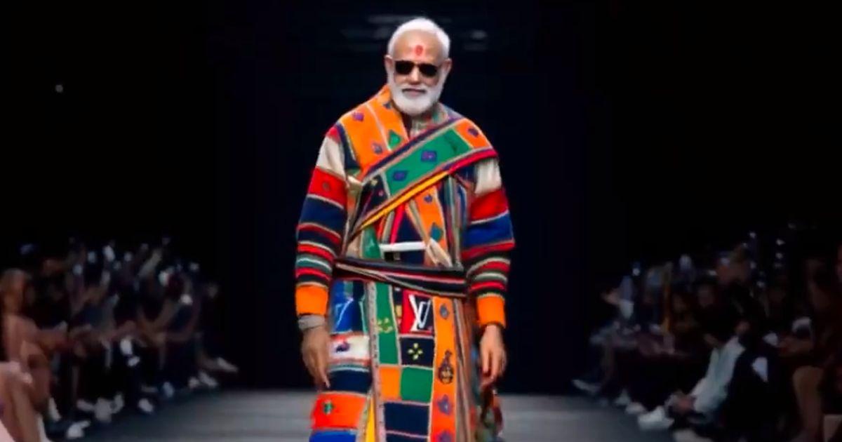 PM Modi is featured walking the runway with swag, donning chic sunshades, and white shoes and wearing a vibrant patchwork ensemble of modern motifs.