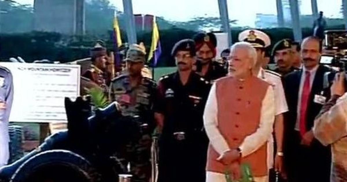 Prime Minister Narendra Modi on Sunday visited an exhibition commemorating World War-I, in which at least 74,187 Indian soldiers died, and was briefed about the valour and sacrifices of martyred defence personnel.