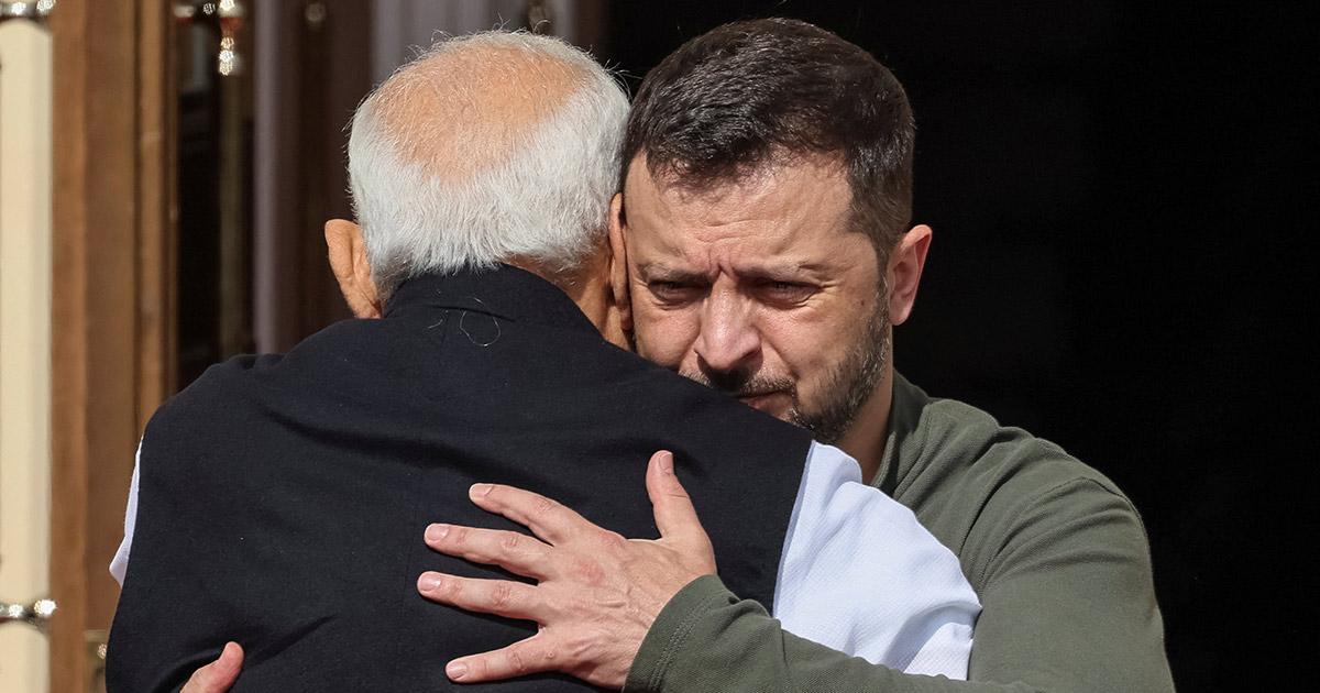 IMAGE: Modi hugs Ukraine's President Volodymyr Zelenskyy, here and below. Photograph: Gleb Garanich/Reuters