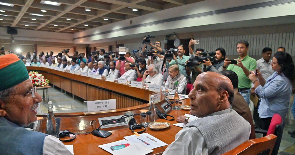 IMAGE: Defence Minister Rajnath Singh chairs an all-party meeting on the eve of the Monsoon Session of the Parliament, in New Delhi on Wednesday. Photograph: Sanjay Sharma/ANI Photo