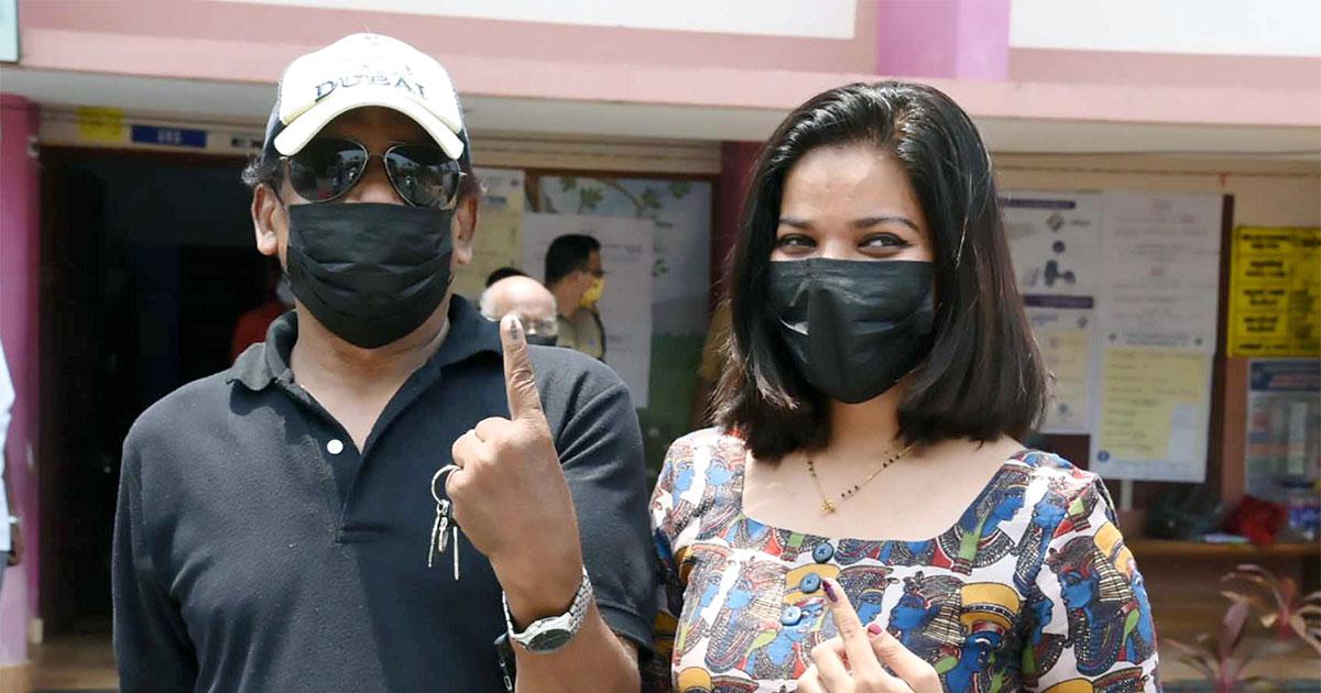 IMAGE: Voters showing the mark of indelible ink after casting their vote in Thiruvananthapuram. Photograph: ANI Photo