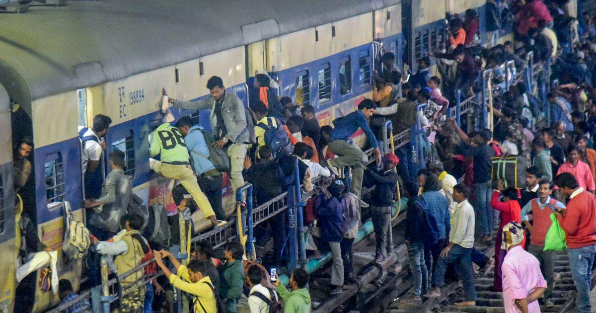 IMAGE: Passengers jostle to board a crowded train due to the ongoing Mahakumbh Mela 2025, at a railway station in Patna on Tuesday. Photograph: ANI Photo