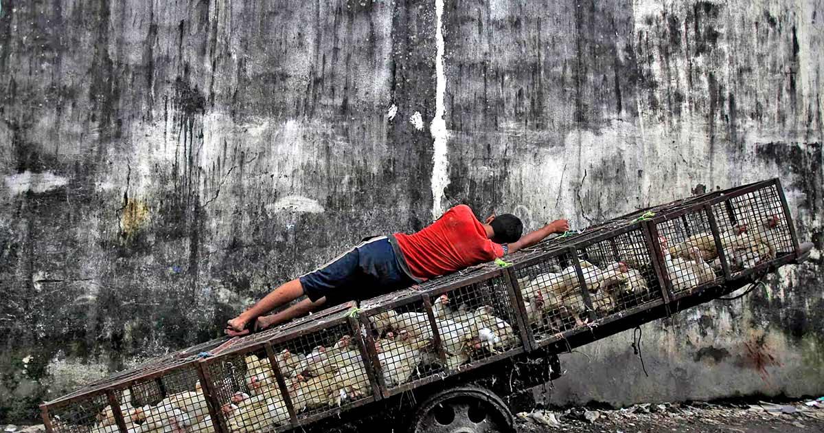 IMAGE: A worker sleeps on a cart full of chickens at a wholesale poultry market. All Photographs: The Late Danish Siddiqui/Reuters
