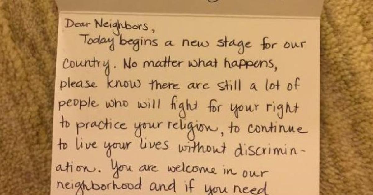 So the day 70-year-old Trump was sworn into office, one of his neighbours in Westwood left this in his mailbox, "Dear Neighbours, today begins a new stage for our country. No matter what happens, please know there are still a lot of people who will fight for your right to practice your religion, to continue your lives without discrimination. You are welcome in our neighborhood and if you need anything -- please knock on our door," a CNN affiliate WCPO reported.