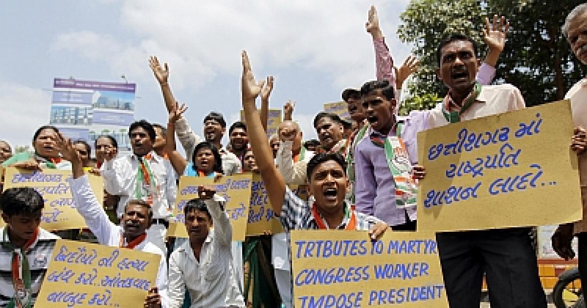 Image: Supporters of the Congress hold placards and shouted anti-Chhattisgarh government slogans during a protest against a recent Maoist attack on party workers | Photograph: Amit Dave/Reuters