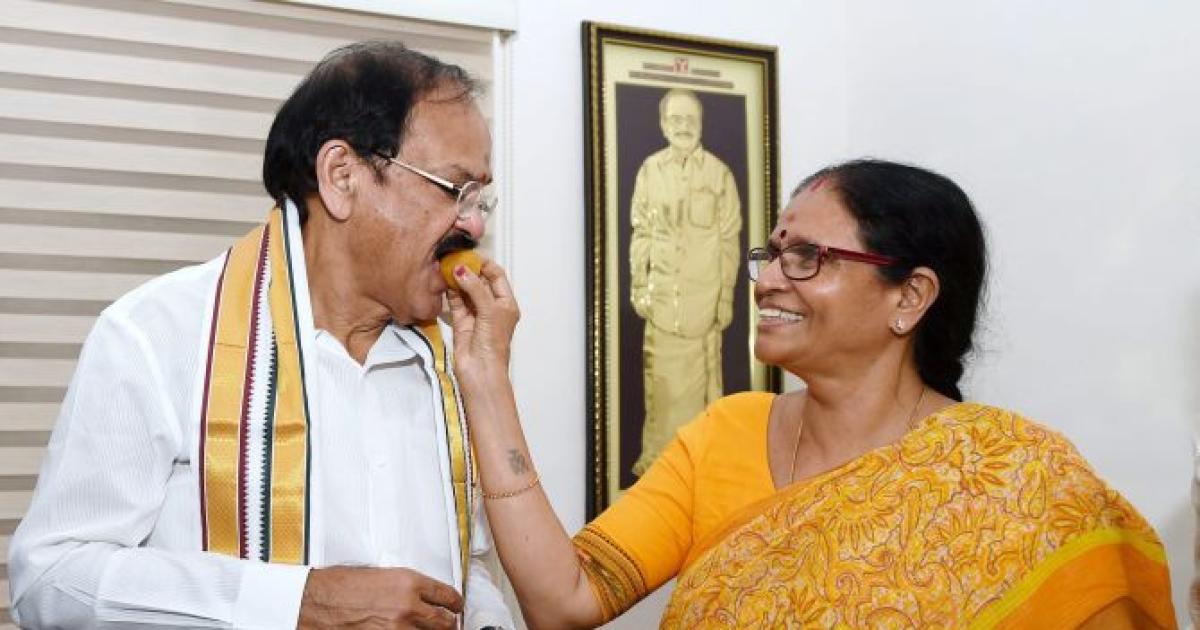 IMAGE: Union Minister M Venkaiah Naidu being offered sweets by his wife Usha at his home, after he was announced as the NDA's vice presidential candidate in New Delhi on Monday. Photograph: Vijay Verma/PTI Photo