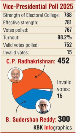 Maharashtra Governor and National Democratic Alliance nominee C P Radhakrishnan was elected the 15th Vice President of India on Tuesday, bagging 452 votes against Opposition nominee and former Supreme Court judge B Sudershan Reddy's 300 votes, amid indications of cross-voting in his favour.