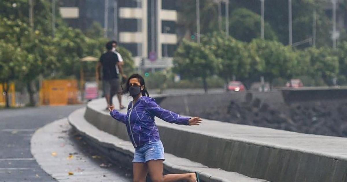 IMAGE: A young woman poses for photographs at Marine drive during Cyclone Nisarga, in Mumbai, on Wednesday. Photograph: Shashank Parade/PTI Photo