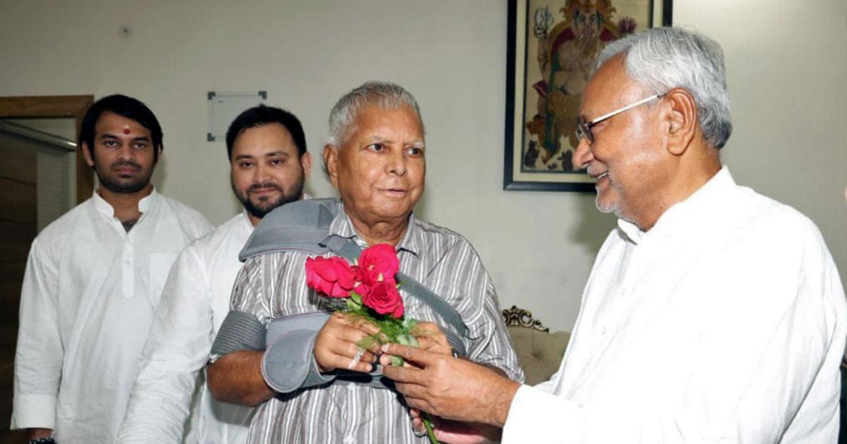 Tejashwi Yadav, Lalu's younger son who has returned as deputy CM after five years, rushed to the bungalow's gate to receive Nitish Kumar.