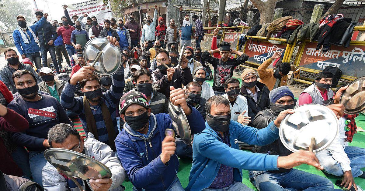 IMAGE: : Secondary Teachers' Eligibility Test (STET) qualified candidates protest for their permanent jobs, in Patna, on Tuesday. Photograph: ANI Photo