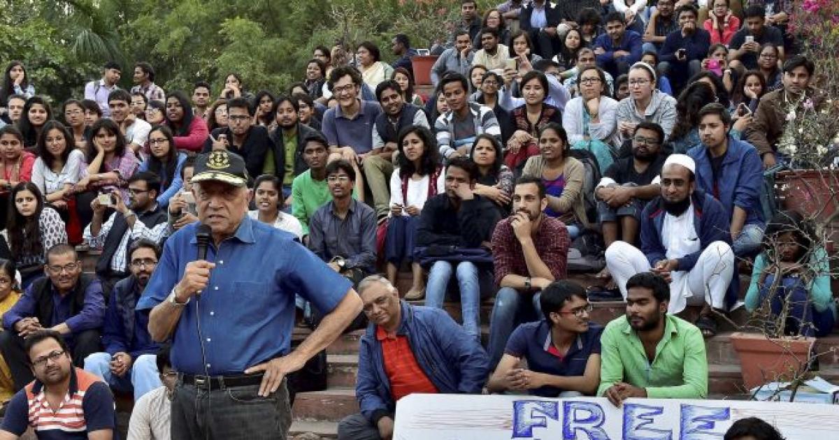 Image: Admiral (Retd) Ramdas addresses students agitating for the release of Kanhaiya Kumar and other students charged with sedition on campus. Photograph: Kamal Kishore/PTI