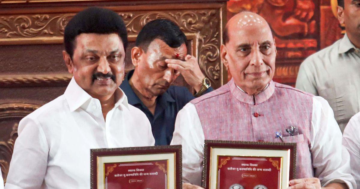 IMAGE: Tamil Nadu Chief Minister M K Stalin and Defence Minister Rajnath Singh at the release a commemorative coin marking the birth centenary of its leader M Karunanidhi in Chennai on August 18, 2024. Photograph: ANI Photo