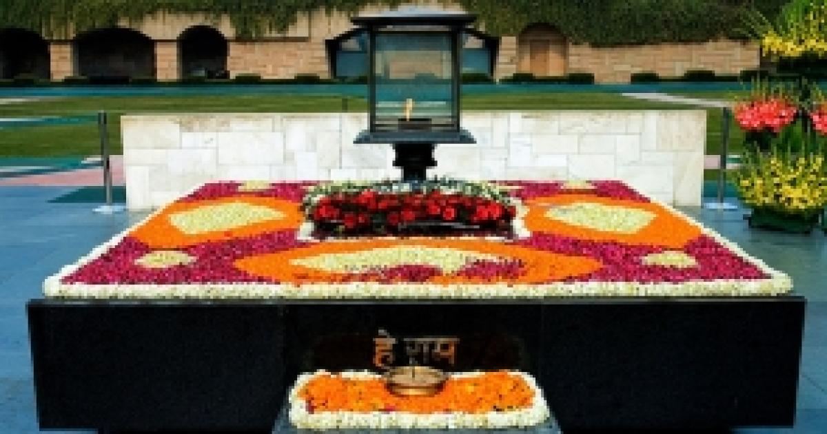 Raj Ghat, built in memory of Mahatma Gandhi, measures 44.35 acres on the western bank of the Yamuna in Delhi. The memorial is a simple square stone platform in black marble.