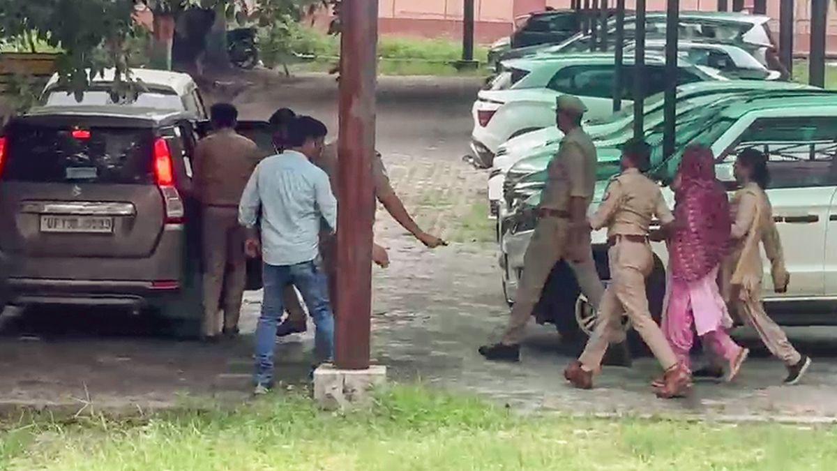 IMAGE: All three accused in Nikki's murder, her father-in-law, mother-in-law and brother-in-law being taken to a 14-day judicial custody, in Noida on Monday. Photograph: ANI Video Grab
