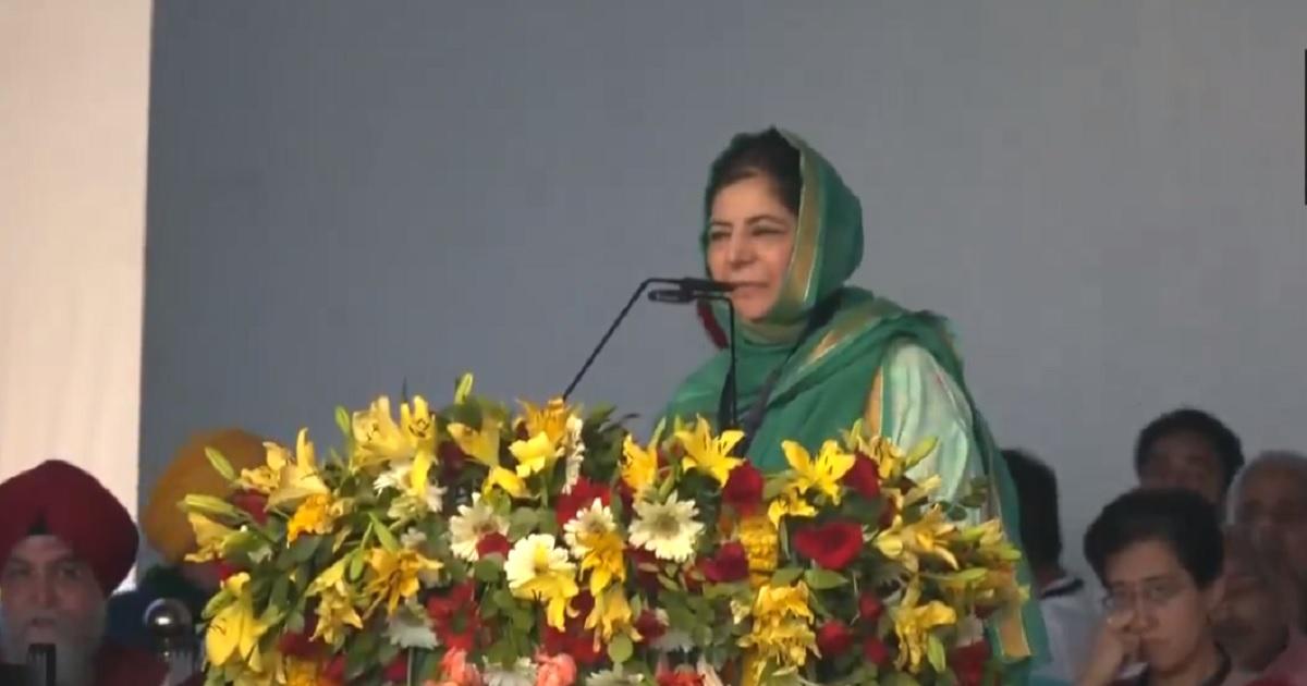 IMAGE: PDP chief Mehbooba Mufti speaks at INDIA rally at Ramlila ground, in New Delhi, March 31, 2024. Photograph: ANI on X