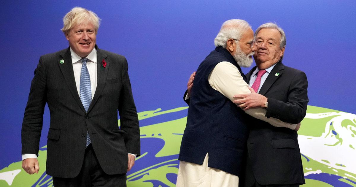 United Nations Secretary-General Antonio Guterres seems startled by the Pradhan Mantri's proximity-propinquity as he arrives at the Scottish Exhibition Centre to attend the World Leaders Summit, COP26, in Glasgow, Scotland, November 1, 2021.