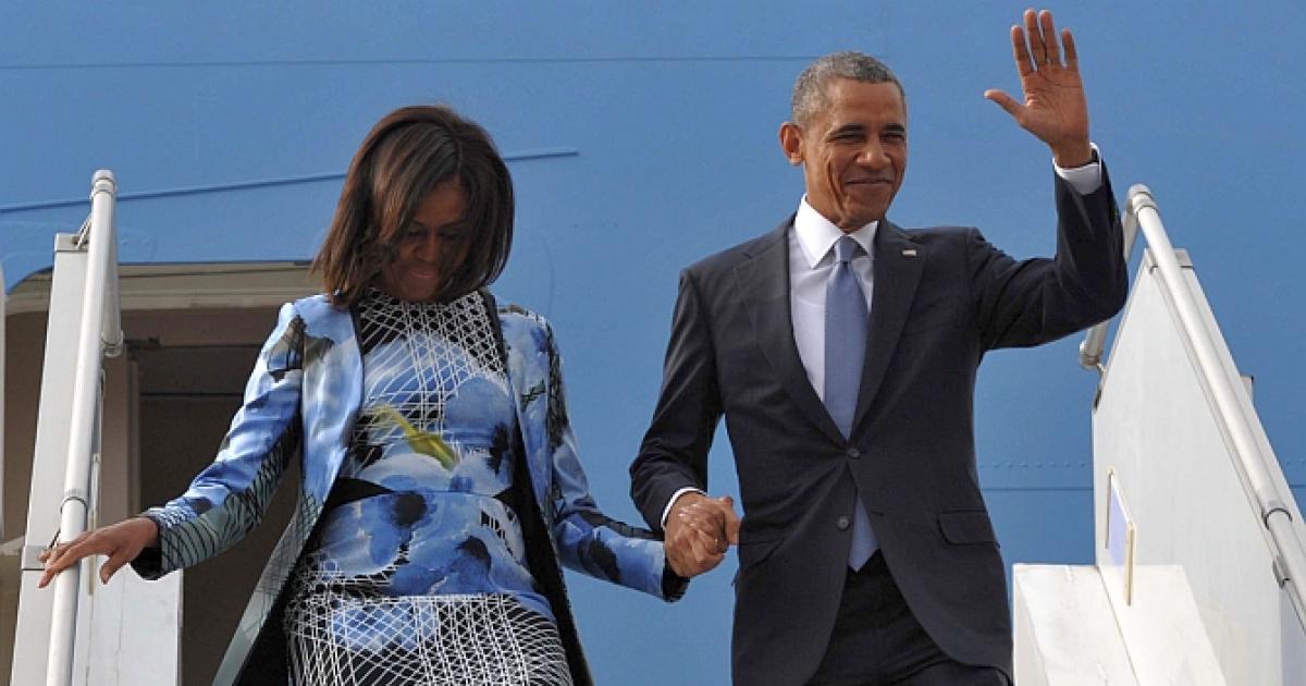 Hand in hand with Barack Obama, Michelle was wore a knee-length dress with geometric prints and blue floral motifs. She put on a matching coat with black pumps and as usual she carried it with grace.