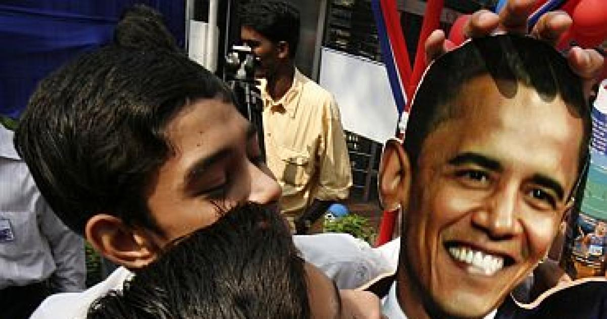 Image: Students reach out to kiss a cutout of Obama at the American Centre in New Delhi. Photograph: Reuters