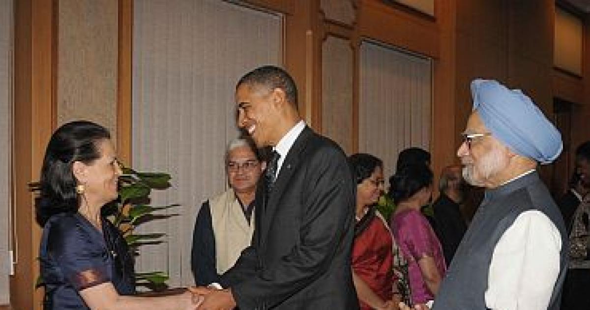 Image: Congress party President Sonia Gandhi greets US President Barack Obama at Prime Minister Manmohan Singh's dinner in New Delhi on Sunday. Photograph: SnapsIndia. Additional inputs: PTI