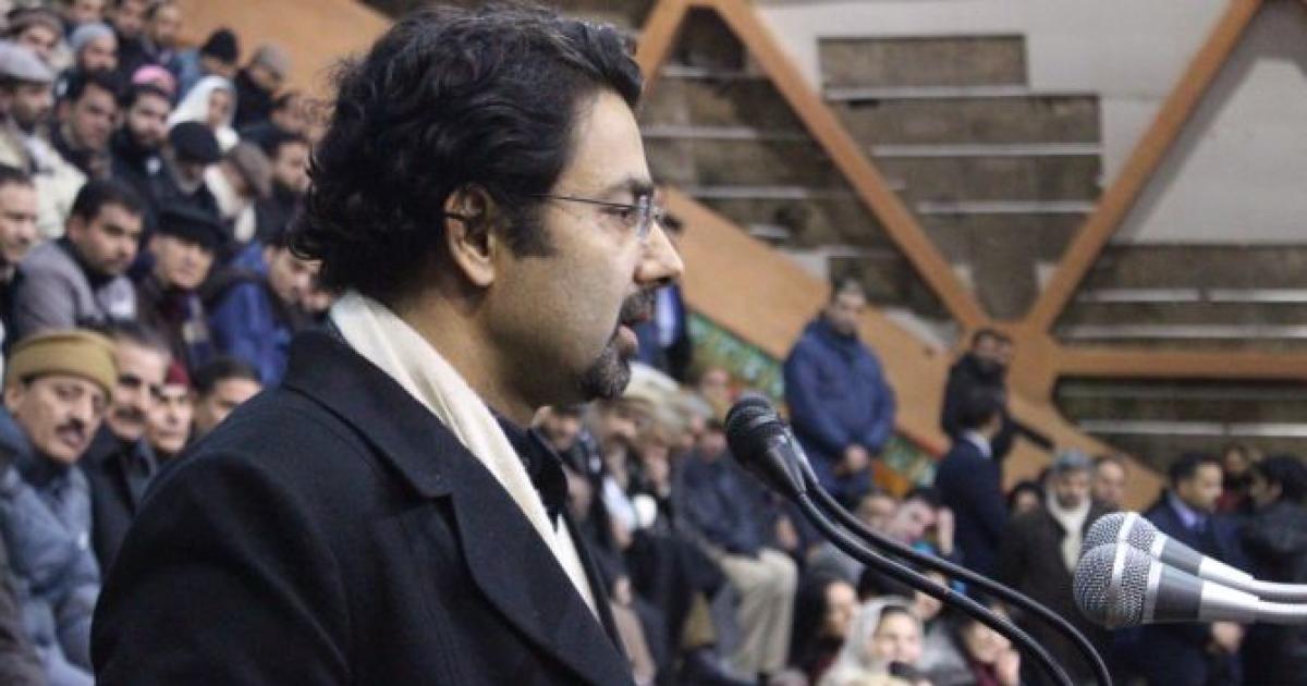 IMAGE: Tassaduq Hussain addresses PDP workers while joining the party on his father's first death anniversary. Photograph: @jkpdp/Twitter