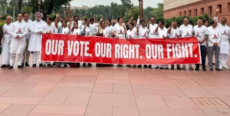 A banner in front of the protesting MPs read "Our Vote. Our Right. Our Fight". Another banner carried by the protesting MPs read "SIR - Silent Invisible Rigging".