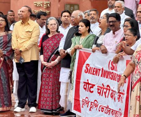 Congress president Mallikarjun Kharge, Congress parliamentary party chief Sonia Gandhi, party general secretary Priyanka Gandhi Vadra, TMC's Derek O'Brien, DMK's TR Baalu, NCP(SP)'s Supriya Sule, as well as other opposition MPs from DMK and Left parties, gathered near Parliament's Makar Dwar. They held posters and raised slogans, demanding a rollback of the Special Intensive Revision (SIR) exercise.