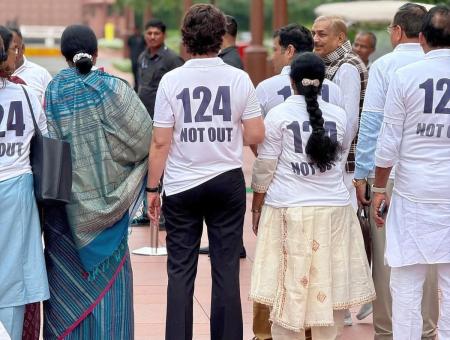 Several MPs of the INDIA bloc parties held a protest in the Parliament House complex on Tuesday against the Election Commission's voter roll revision in Bihar, with many of them wearing white T-shirts that had the name of a "124-year-old voter" allegedly found on the state's voters' list emblazoned on it.