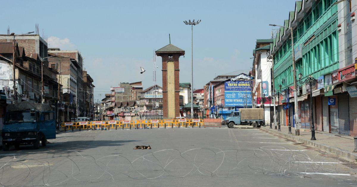 IMAGE: Barbed wire is seen laid on a deserted road during restrictions in Srinagar. Photograph: Umar Ganie/Rediff.com