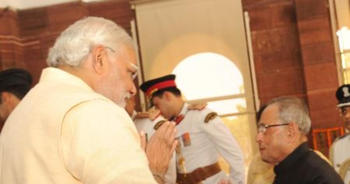 Image: Prime Minister Narendra Modi greets President Pranab Mukherjee as he prepares to address a joint session of Parliament. Photograph: Press Information Bureau