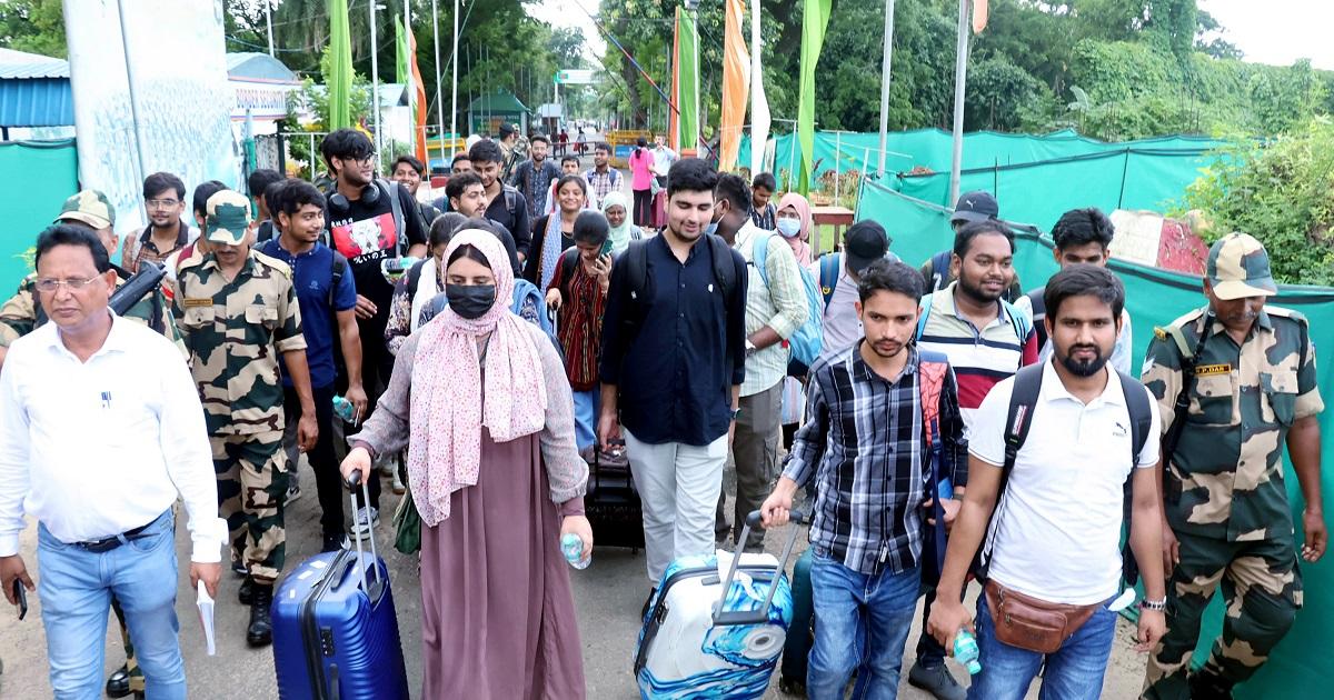 IMAGE: Indian students studying in Bangladesh return to India through the Akhaura International check post after deadly clashes in Bangladesh, in Agartala, Tripura, July 20, 2024. Photograph: ANI Photo